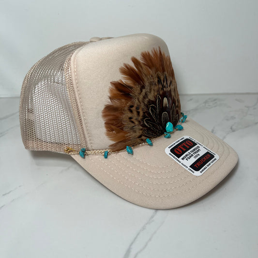 FEATHER Trucker Hat Tan WITH Turquoise Beaded Hat Chain