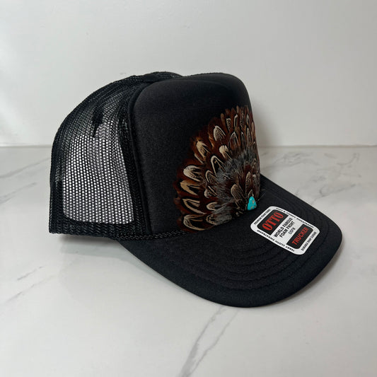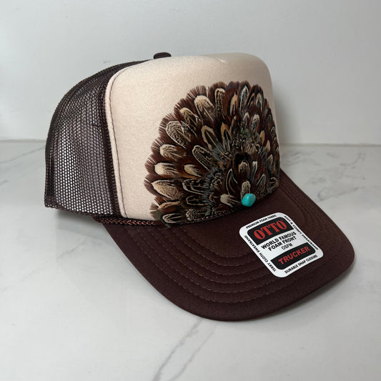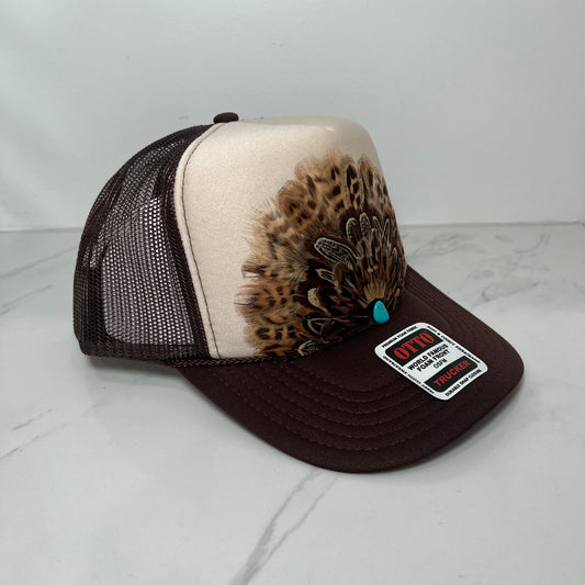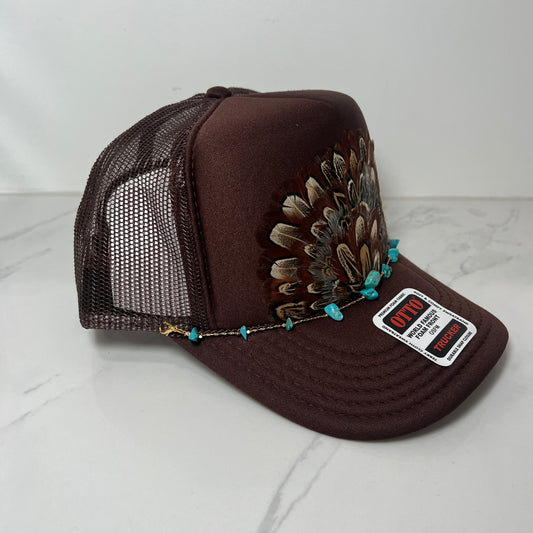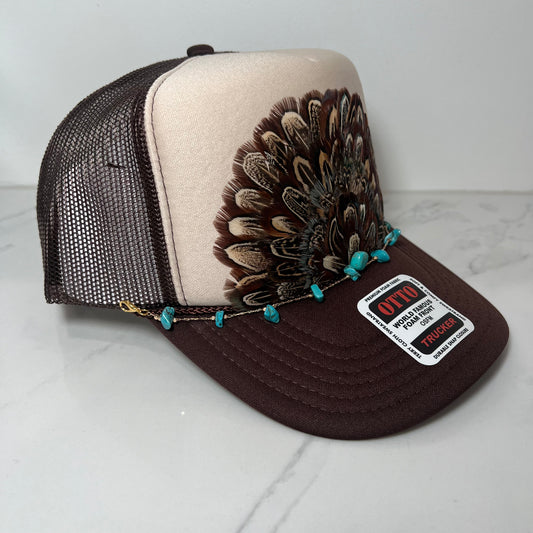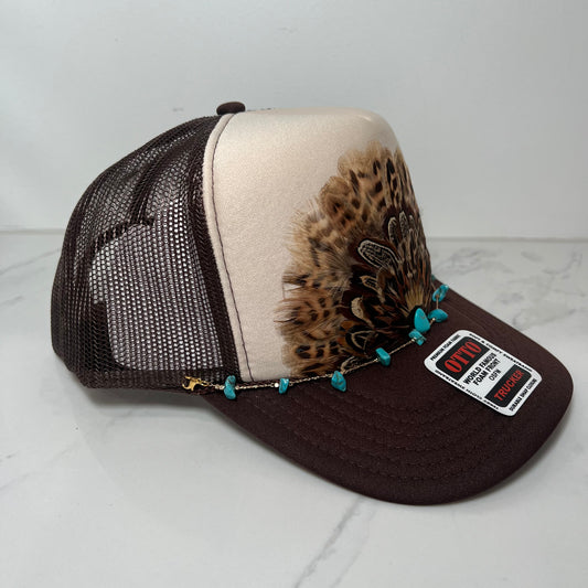 FEATHER Trucker Hat Brown WITH Turquoise Beaded Hat Chain