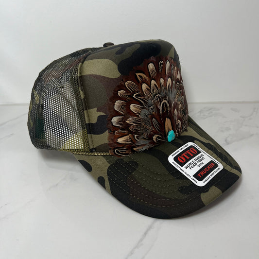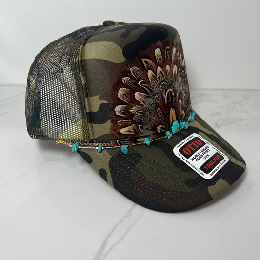 FEATHER Trucker Hat Allover Camo WITH Turquoise Beaded Hat Chain