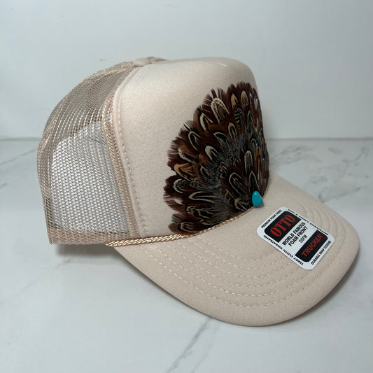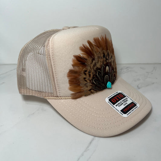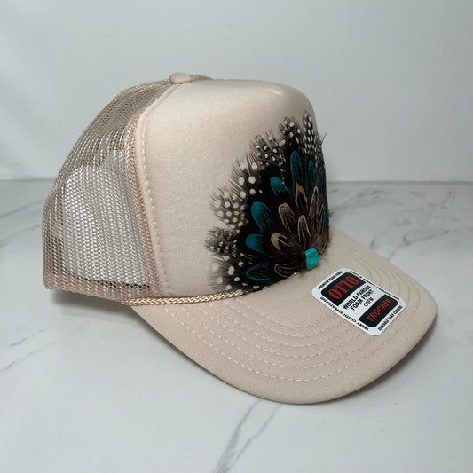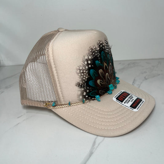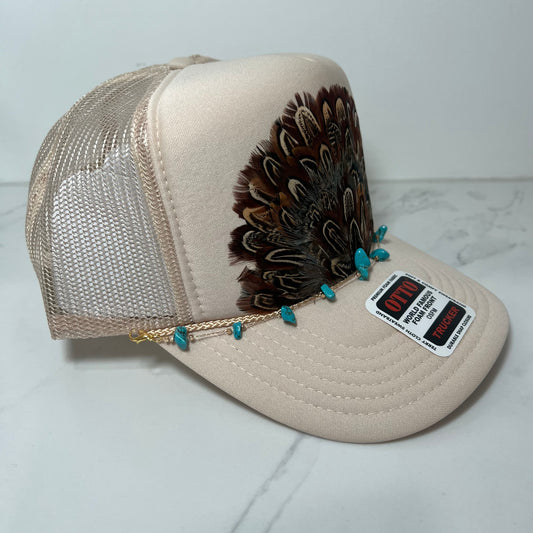 FEATHER Trucker Hat Tan WITH Turquoise Beaded Hat Chain