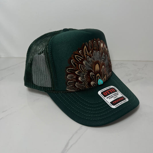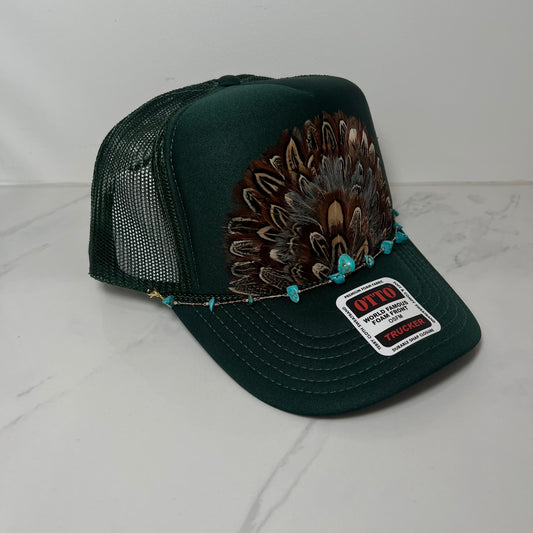 FEATHER Trucker Hat Dark Green WITH Turquoise Beaded Hat Chain