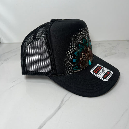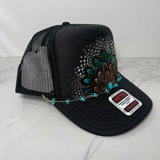 FEATHER Trucker Hat Black White Spotted Black with Blue Feathers WITH Turquoise Beaded Hat Chain