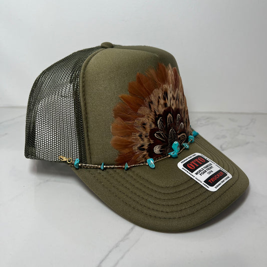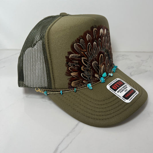 FEATHER Trucker Hat Olive Green WITH Turquoise Beaded Hat Chain