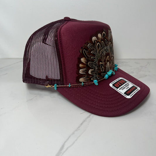 FEATHER Trucker Hat Maroon WITH Turquoise Beaded Hat Chain
